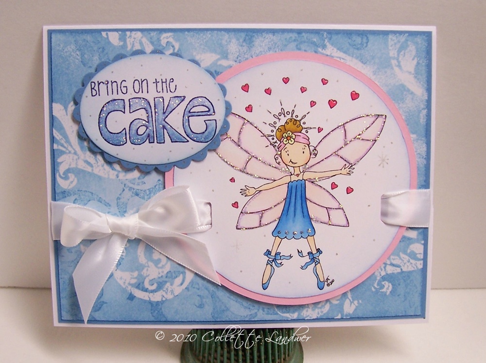 This first one ended up being 5x7 because I didn't pay attention when I was enlarging this digital Cynthia image from The Stamping Boutique. She was colored with Copics then I added some diamond Stickles to her wings and dress, then some glossy accents to the hearts. This sentiment is from Unity's November KOM. Because I stamped with SU ink, I colored this with blender pen and marina mist ink, then added a bit of Stickles to the "CAKE" part. Jumbo circle was cut with Creative Memories cutting system thenm punched to thread the ribbon through. The sentiment was cut with Nesties. Background was actually handmade. I used white base then clear embossed vintage flourish then sponged Marina mist to pop up the embossed part. Went over some of it with the same flourish stamped in marina mist for texture.